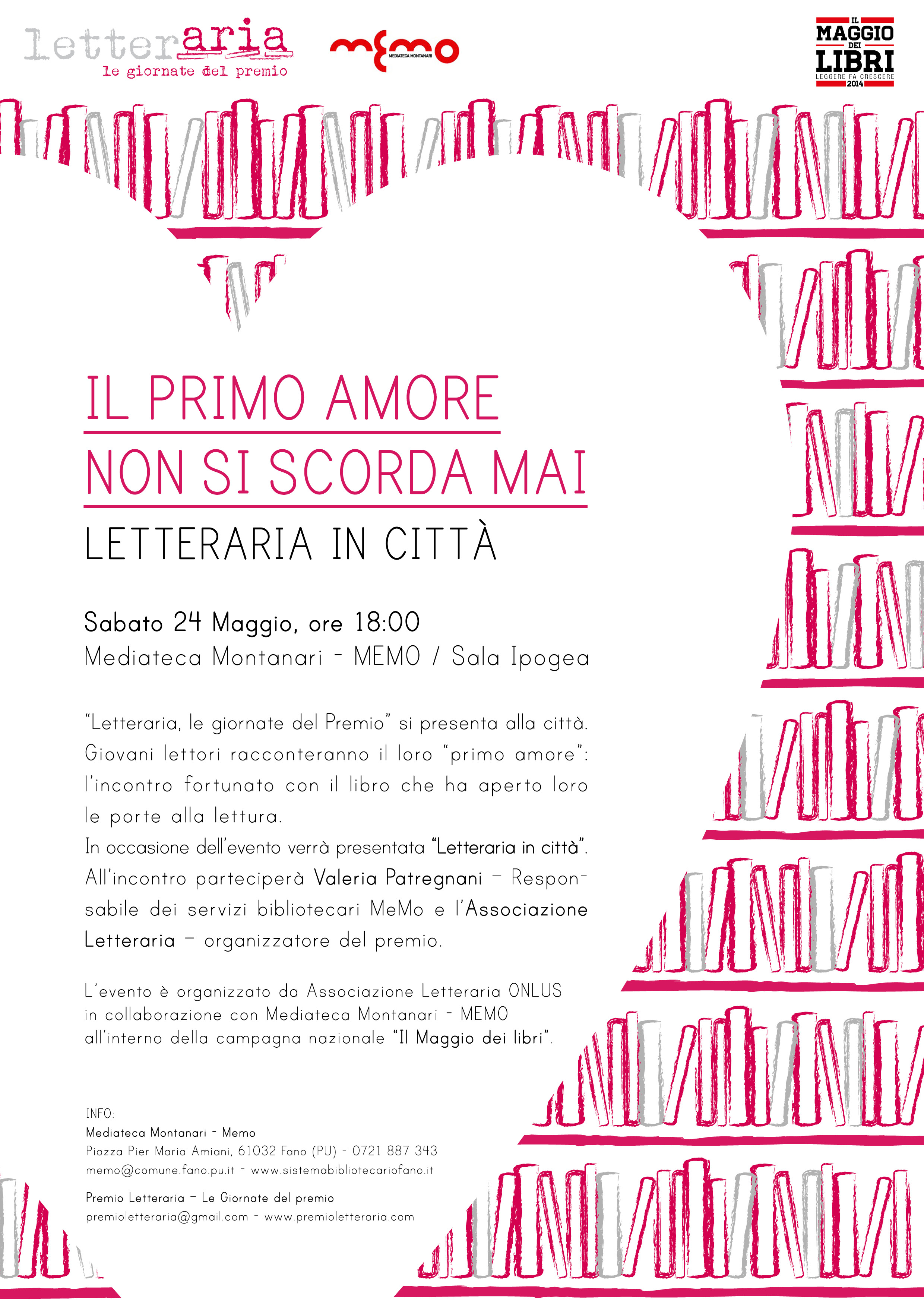 “Letteraria, le giornate del Premio”, manifestazione incentrata sul valore del libro e della lettura e quest’anno alla sua prima edizione, si presenta sabato 24 maggio 2014 alla città di Fano all’interno della campagna nazionale “Il Maggio dei libri”. A dar voce a Letteraria saranno alcuni degli studenti volontari dei gruppi di lettura, coinvolti nel premio in veste di giuria, e racconteranno l’incontro fortunato con il libro che ha aperto loro le porte della lettura: il “primo amore”.